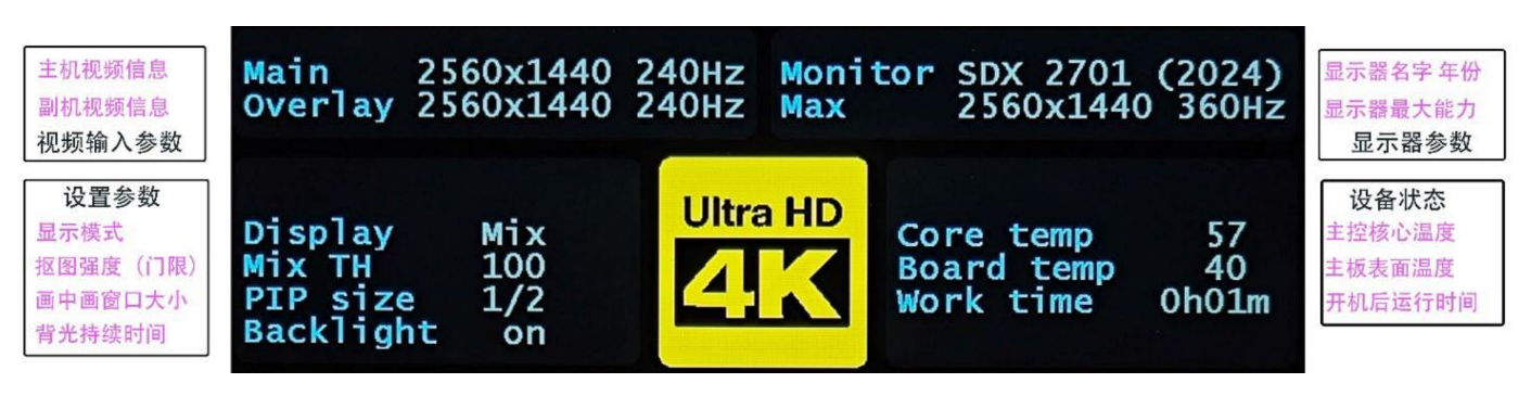 2.按下开机按钮,待红灯转为蓝灯常亮即正常工作,等待几秒后应能在显示器上显示画面,观察小屏;,幕上的显示器信息是否显示,两个输入口信息是否有显示;