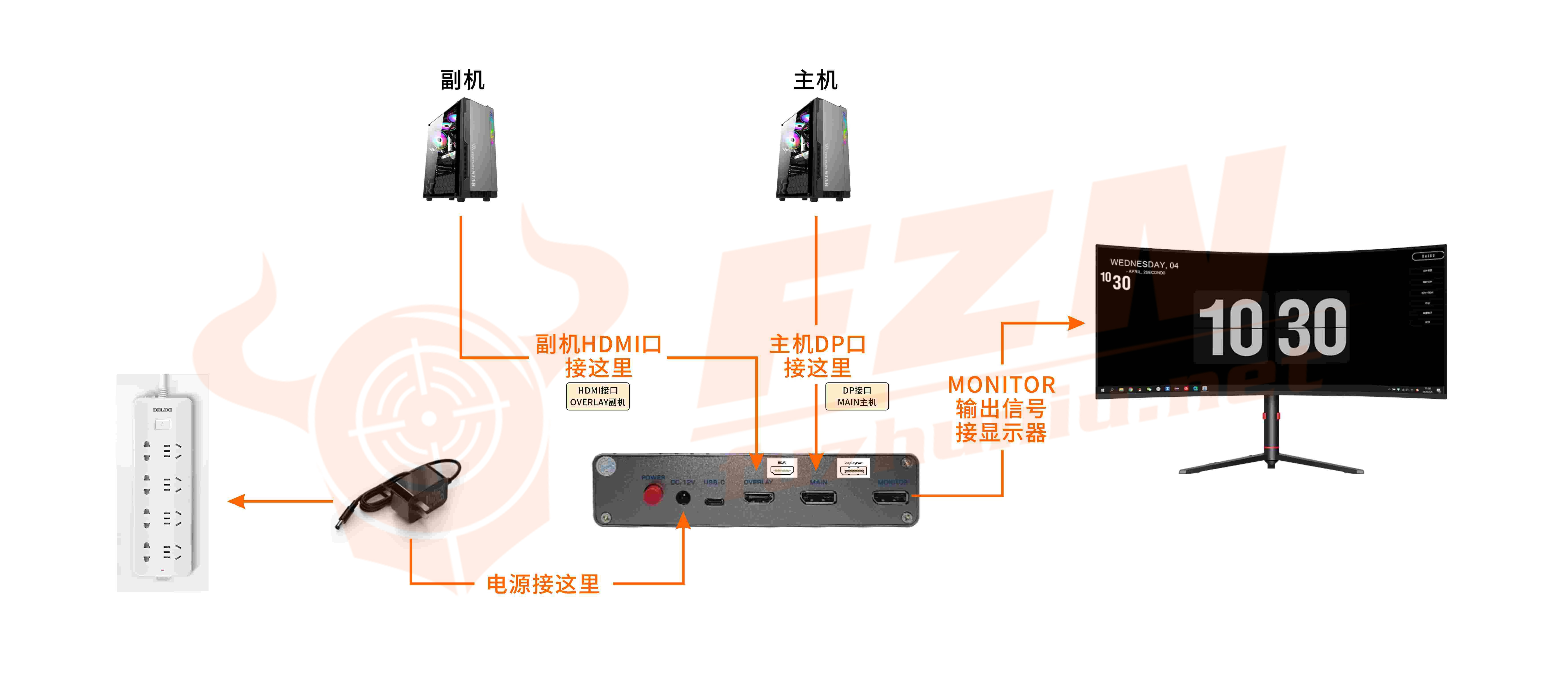 1.融合器上电前先接好电源线,副机显卡接HDMI线到融合器输入HDMI2.1接口,主机显卡接DP线到融合器输入DP1.4接口,融合器输出DP1.4接显示器DP接口;