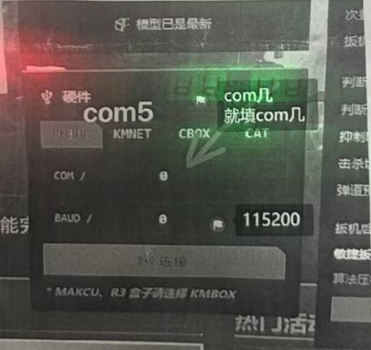 连接方式选择KMBOX B+,波特率填115200,COM端口你是几就填几,然后点击连接
