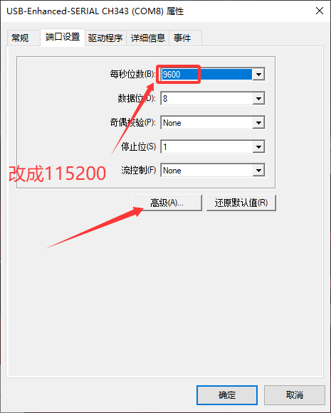 (1) 在端口设置内把波特率(每秒位数)改成115200,然后点击高级