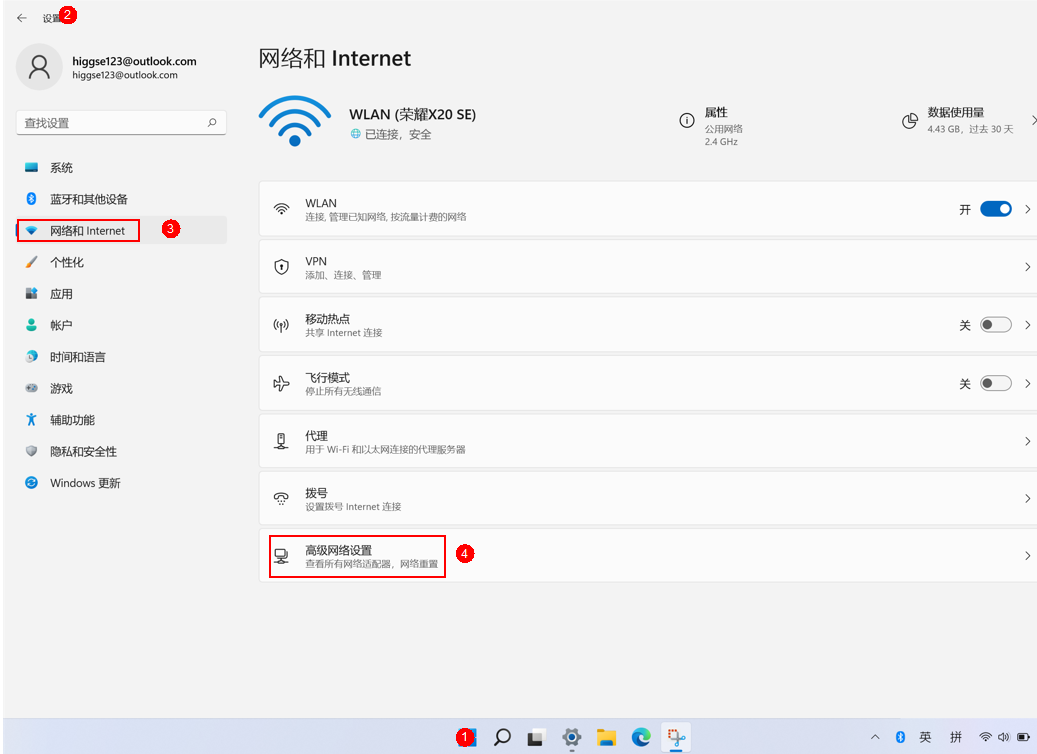 1.点击Windows 图标 > 设置图标 > “网络和Internet”,选择“高级网络设置”;