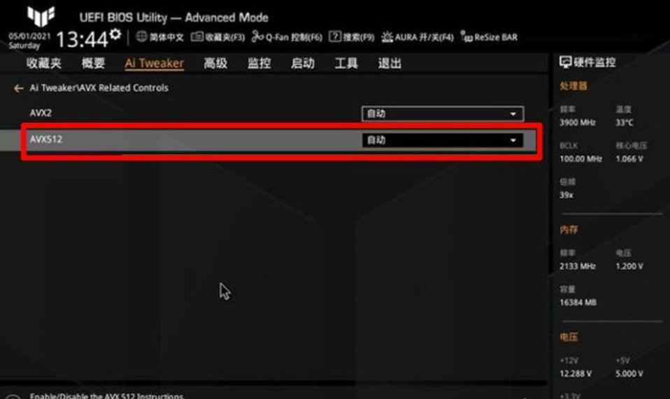 2.按下F7键或者点击选择“Advanced Mode”进入高级模式,进入“Ai Tweaker”选项,找到“AVX Related Controls”并点击进入,将AVX512选项由自动修改为关闭“Disabled”;