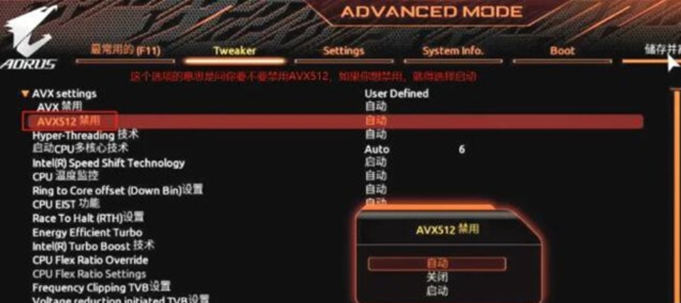 2.再按下F6进入高级模式“advanced mode”,在“Tweaker”选项卡中,进入“进阶处理器设置”,找到“AVX512禁用”选项,将自动修改为“启用”;