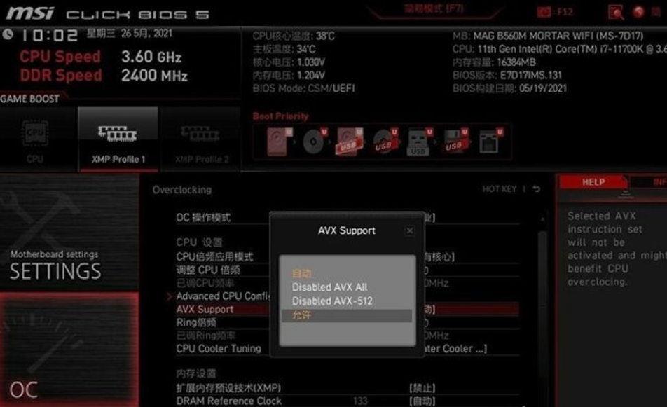 2.鼠标点击顶部的“Advanced(F7)”高级模式,或者直接按下F7键进入高级模式,鼠标点击“OC”选项,找到AVX Support,选择Disabled AVX-512,禁用掉;