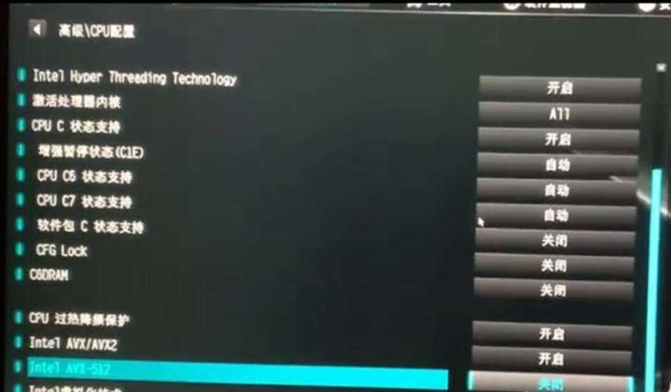 2.按下F6进入高级模式,在“高级”选项卡中,进入CPU配置,找到intel AVX-512,选项选择关闭即可;、