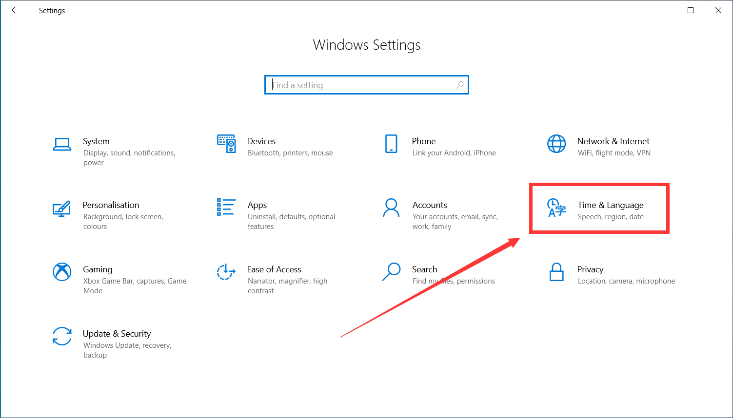 1.打开设置,在控制面板找到时间语言设置。