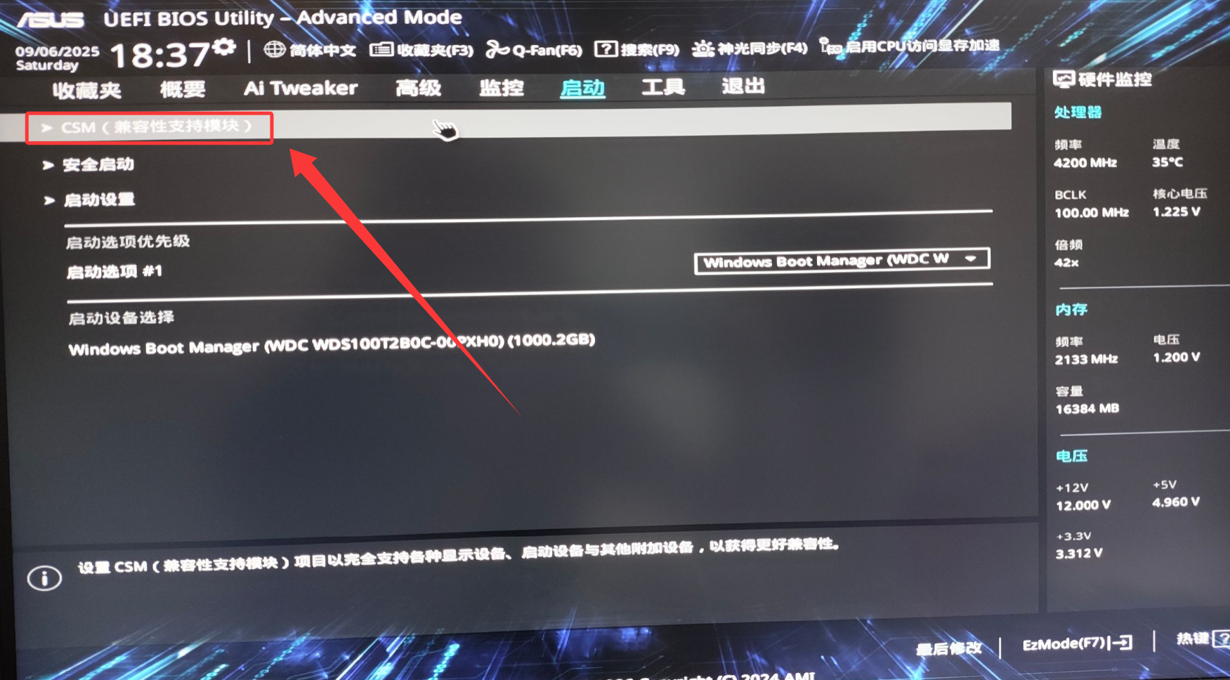 3.进入启动设置选项内的CSM(兼容性支持模块);