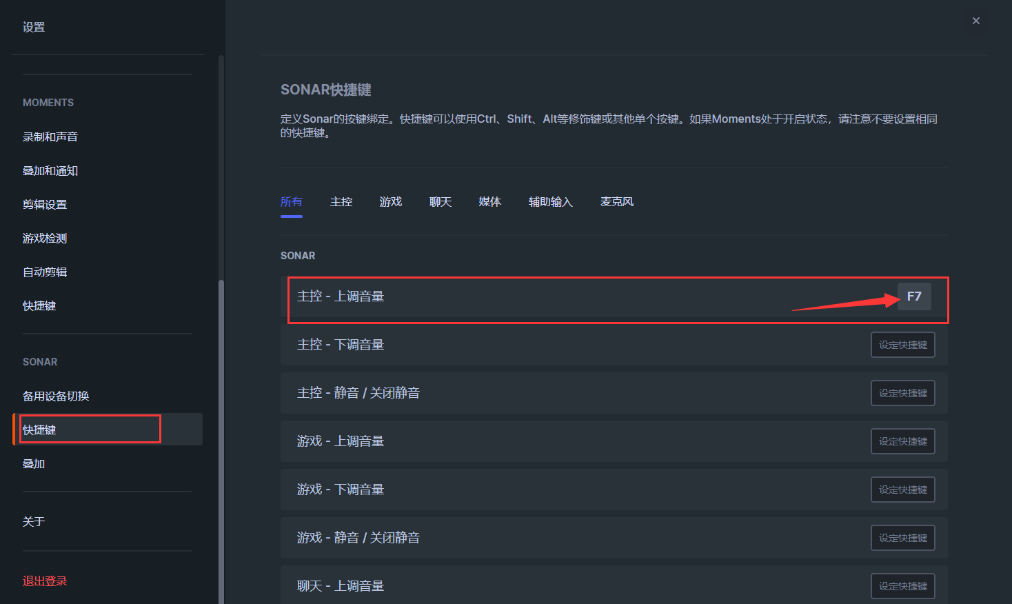 4.在快捷键设置中,将主控-上调音量快捷按键设置为F7;